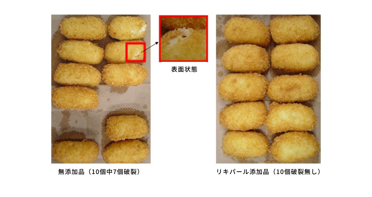 冷凍クリームコロッケ油調時のパンク防止効果とサクサク感が維持出来ます。